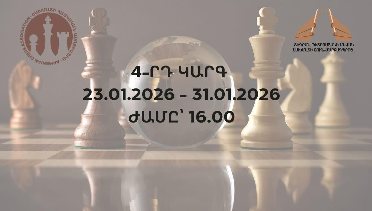 Տ. Պետրոսյանի անվան շախմատի տուն-մարզադպրոցում ս.թ. հունվարի 23-31-ը կանցկացվի Շախմատի հայկական ասոցիացիայի հետ համատեղ կազմակերպած 4-րդ կարգի որակավորման մրցաշար:Մրցաշարը կանցկացվի երկու խմբով.1-ին խ...