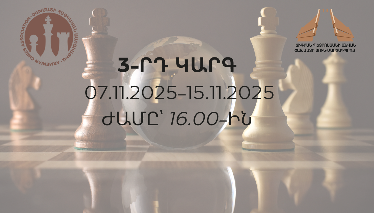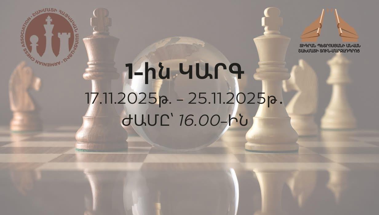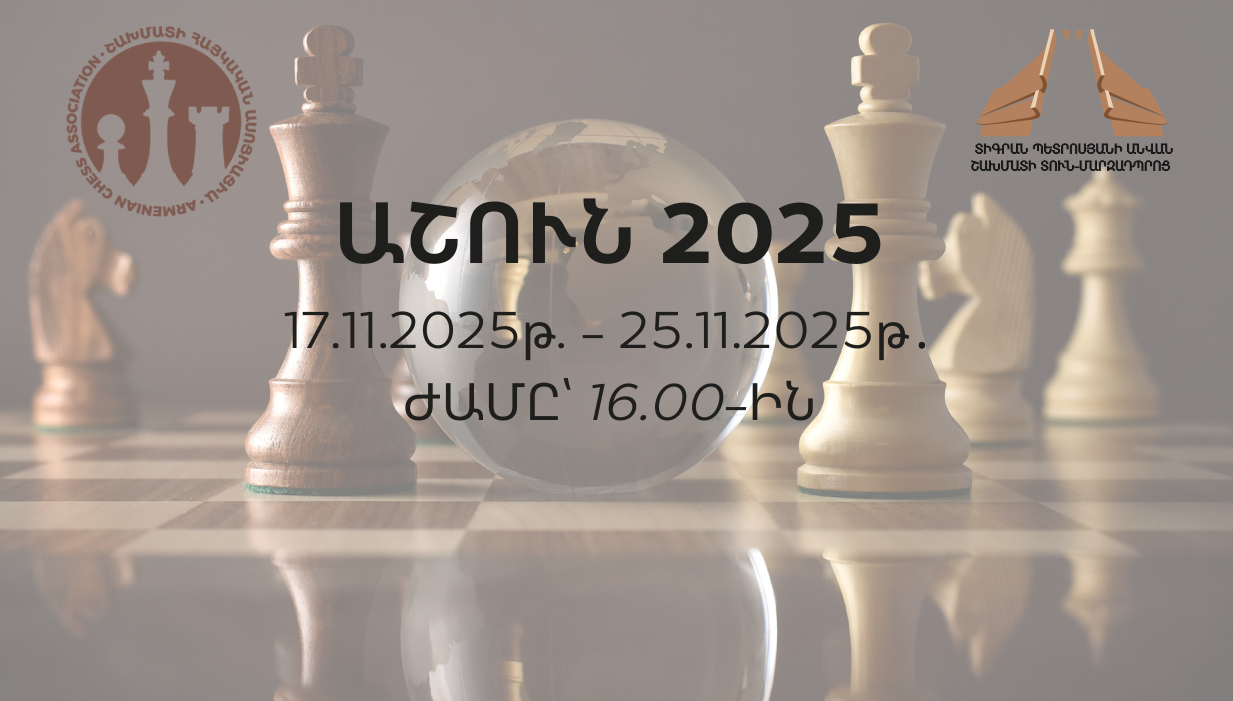 Ս.թ. նոյեմբերի 17-25-ը Տ. Պետրոսյանի անվան շախմատի տուն-մարզադպրոցում կանցկացվի Շախմատի հայկական ասոցիացիայի հետ համատեղ կազմակերպած «Աշուն 2025» միջազգային հաշվարկով վարկանիշային մրցաշարը։Մրցաշարը կա...